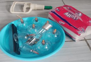 Jum’at siang, sesudah salat Zuhur, saya pun berangkat dan mampir ke Bu Yuni terlebih dahulu. Kami pun disambut dengan ramah. Beliau sudah tahu maksud kedatangan kami. Disuruhnya wudu dan dipersilahkan masuk. Ustazah mempersiapkan peralatannya, seperti: alat vacum dan pompa, jarum suntik dan pena, minyak zaitun dan juga tissu.